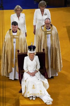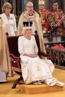 A szemfüles résztvevők hamar észrevehették, hogy az új királyné Westminster-apátságban viselt öltözéke igazán különlegesen díszített. Kedvenc tervezője, Bruce Oldfield kiváló munkát végzett a koronázási ruhán. Kamilla királyné megjelenése minden részletében szimbolikusnak tekinthető. Nem csak a brit monarchia örök érvényűségét, de férje uralkodói terveihez kapcsolódóan a fenntarthatóság jegyeit is magán viselte. Nyakát a néhai II. Erzsébet által a saját koronázásán viselt nyakék díszítette, amit az előző uralkodó még Viktória királynőtől kapott ajándékba.