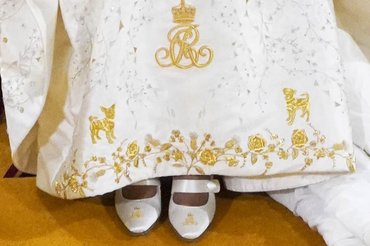 A király és királyné a monarchia történetében egyedülálló kapcsolatot követően, elváltként, újraházasodva érkeztek meg életük egyik legfontosabb napjához. A kettejük közötti szeretetet és kapcsolatot két jack russeljük hímzett képmása jelenítette meg, az új királyi címert közrefogva.
